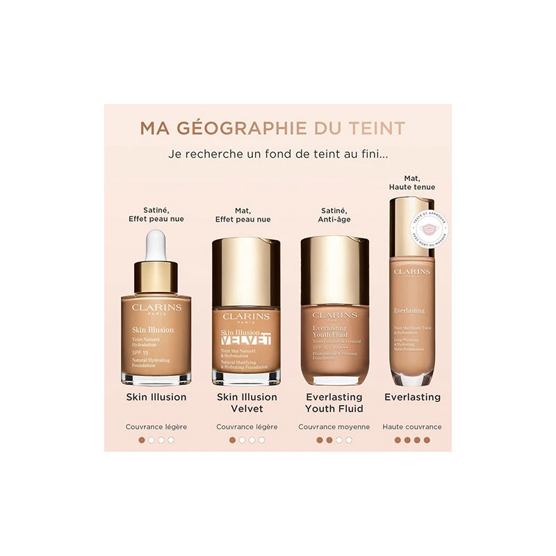 Dans mon maquillage, tout le soin Clarins Le fond de teint fini mat naturel qui contrôle les brillances toute la journée.