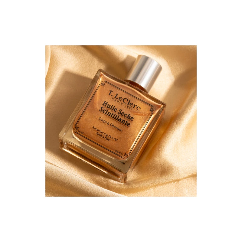 Lhuile sèche scintillante recouvre la peau dun voile pailleté.